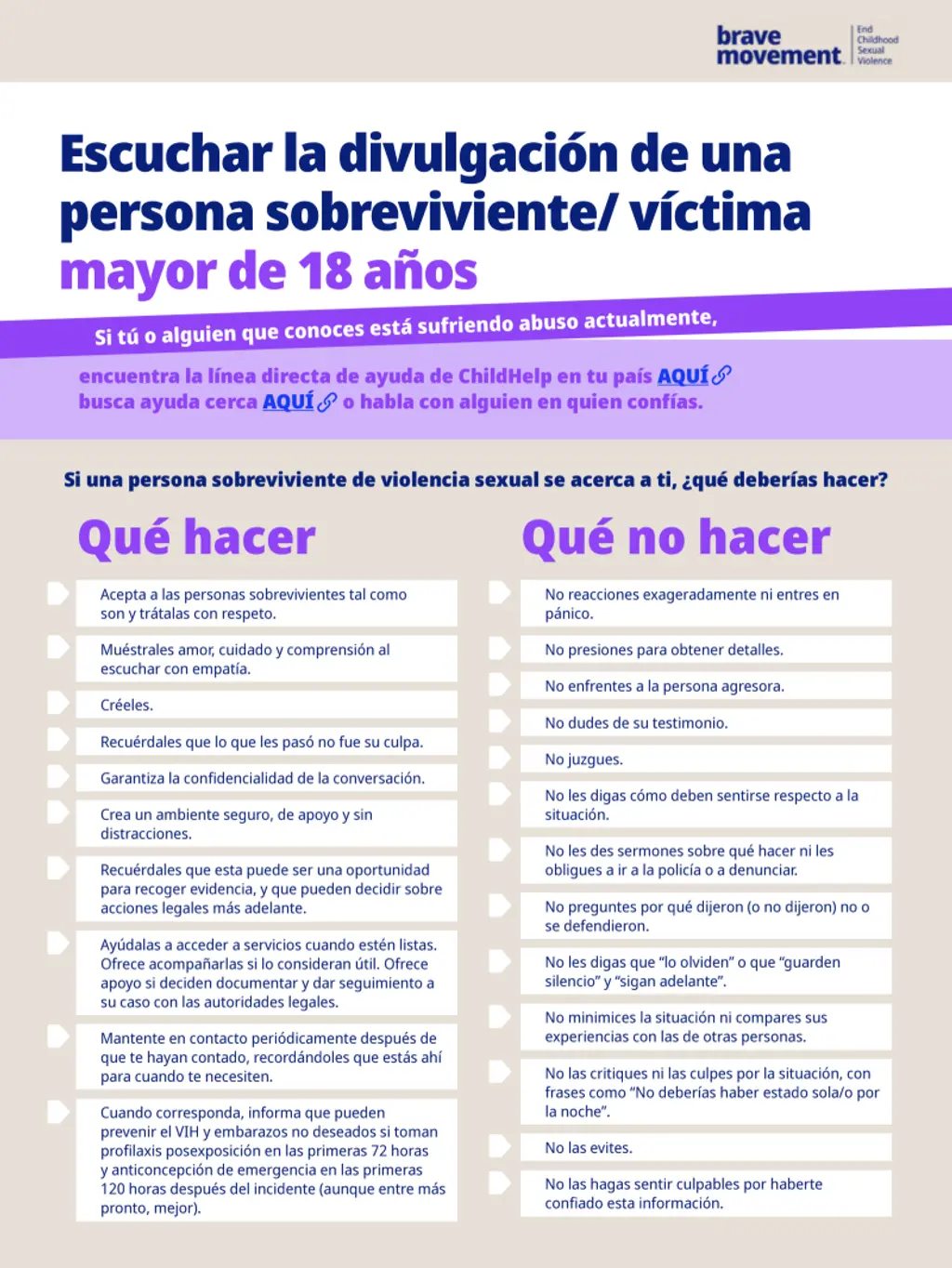 El Brave Movement ofrece algunos consejos para ayudarte a entender qué hacer si una persona sobreviviente de violencia sexual se lo confÃa a ti.