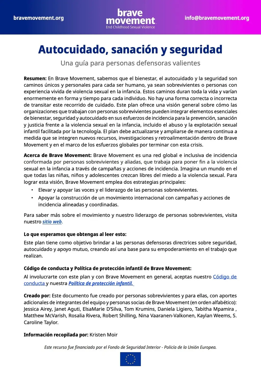 No existe una forma correcta o incorrecta de transitar este camino de cuidado. Este plan ofrece una visión general de cómo las organizaciones que trabajan con personas sobrevivientes pueden integrar elementos esenciales de bienestar, seguridad y autocuidado en sus esfuerzos de incidencia para la prevención, la sanación y la justicia en relación con la violencia sexual contra la infancia, incluida la violencia y explotación sexual infantil facilitada por la tecnología.