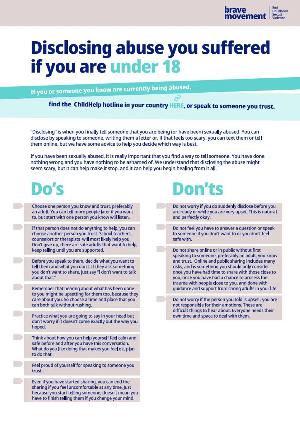 "Disclosing" is when you tell someone that you are being (or have been) sexually abused. You can disclose by speaking to someone, writing them a letter or, if that feels too scary, you can text them or tell them online, but the Brave Movement have some advice to help you decide which way is best.