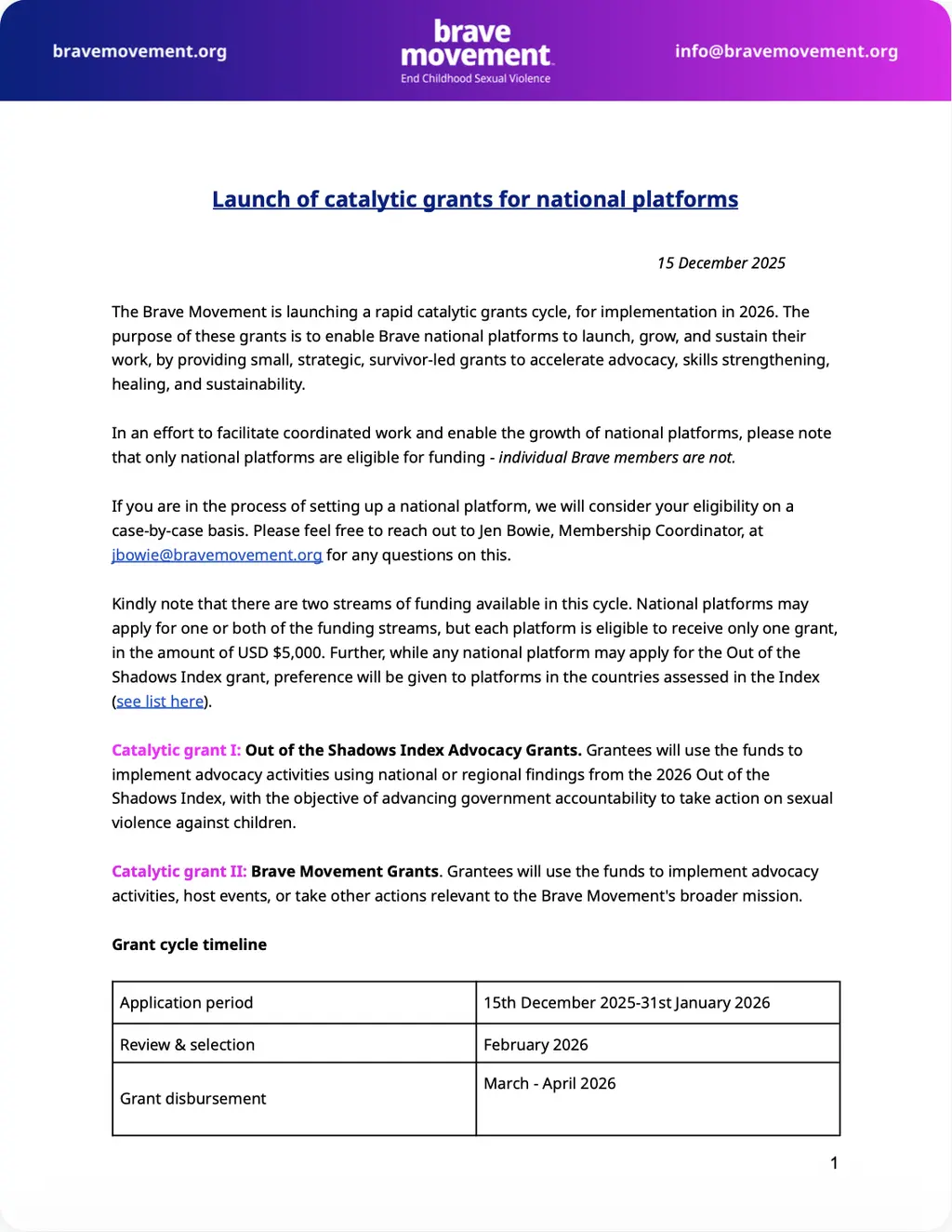 The Brave Movement is launching a rapid catalytic grants cycle, for implementation in 2026. The purpose of these grants is to enable Brave national platforms to launch, grow, and sustain their work, by providing small, strategic, survivor-led grants to accelerate advocacy, skills strengthening, healing, and sustainability.