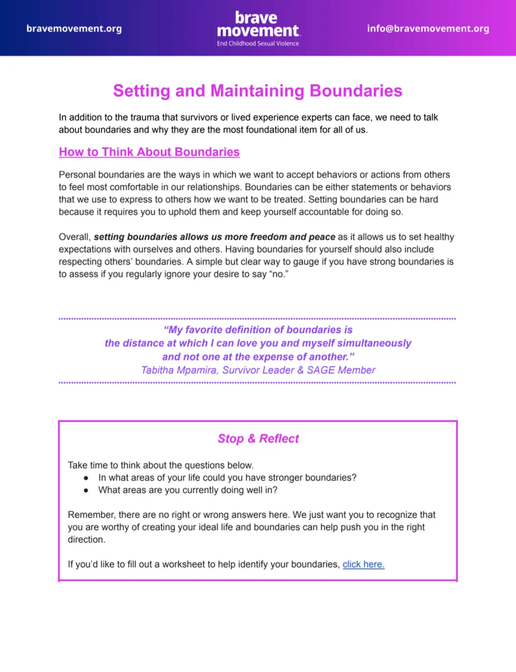 Boundaries can be either statements or behaviors that we use to express to others how we want to be treated. Setting boundaries can be hard because it requires you to uphold them and keep yourself accountable for doing so.
