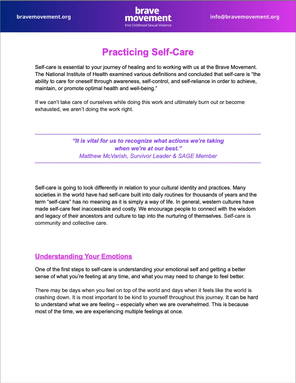 Self-care is essential to your journey of healing and to working with us at the Brave Movement. The National Institute of Health examined various definitions and concluded that self-care is “the ability to care for oneself through awareness, self-control, and self-reliance in order to achieve, maintain, or promote optimal health and well-being.”