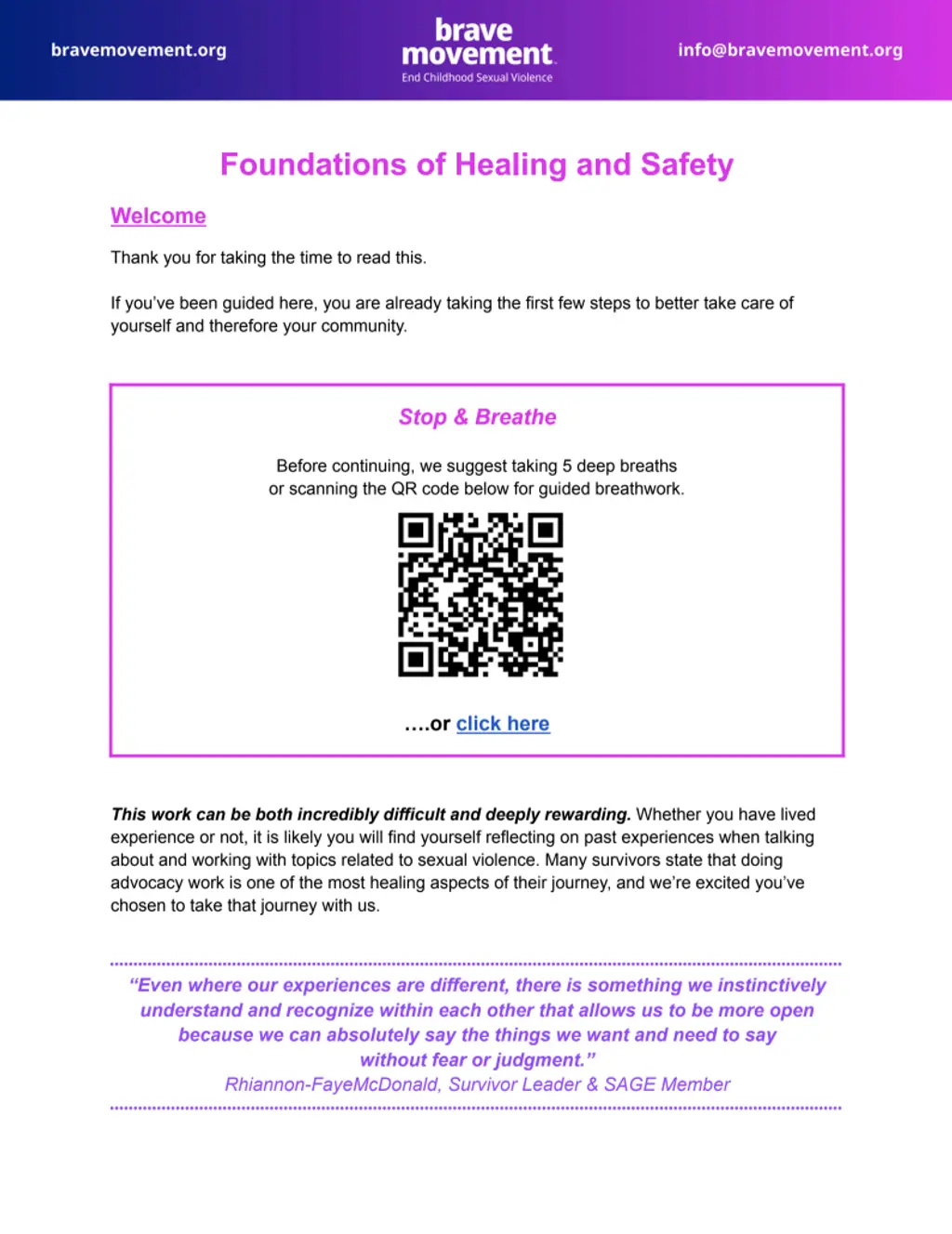 sexual violence around the world. This resource explores the Brave Movement's foundations of healing and safety, and what we mean by these terms.