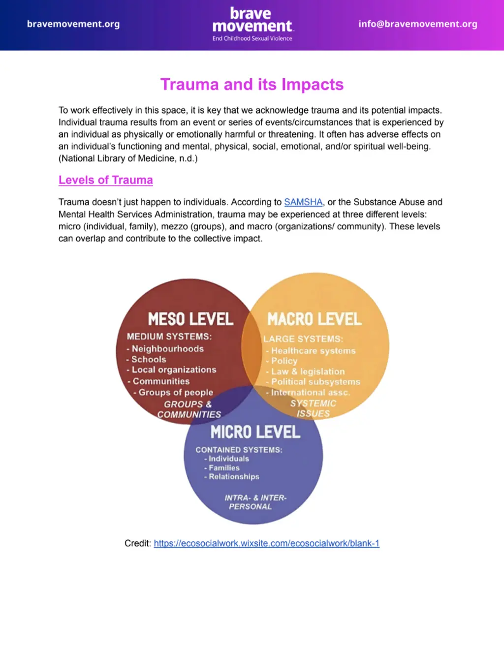 To work effectively in this space, it is key that we acknowledge trauma and its potential impacts. Individual trauma results from an event or series of events/circumstances that is experienced by an individual as physically or emotionally harmful or threatening. It often has adverse effects on an individual’s functioning and mental, physical, social, emotional, and/or spiritual well-being.